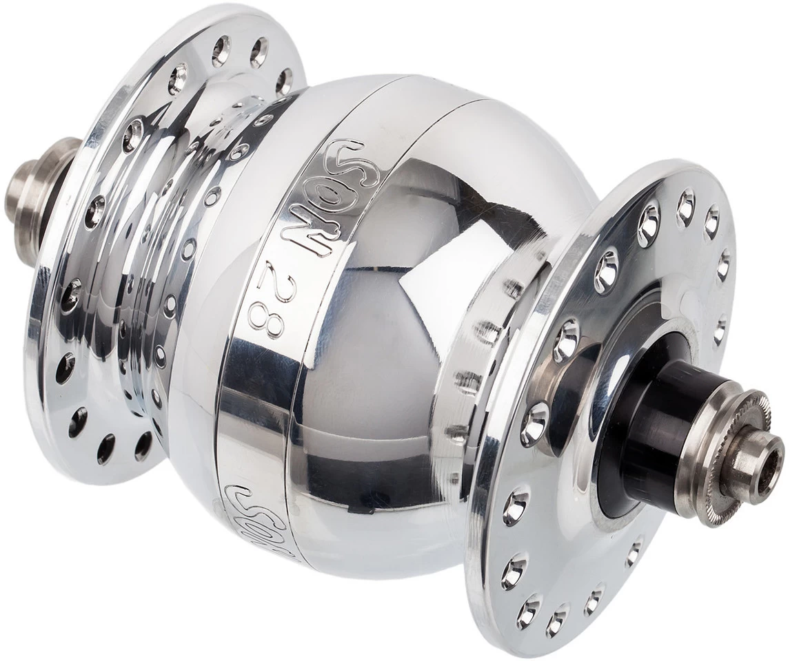 Der SON 28 ist ein universell für alle Laufradgrößen von 16″ bis 29″ zugelassener Nabendynamo. Die Nennleistung erreicht er im 28″ -Rad bei ca. 16 km/h. Damit ist er zu empfehlen, wenn bei langsamer Fahrt besonders viel Licht benötigt wird oder andere Geräte betrieben bzw. deren Akkus geladen werden sollen. Im Vergleich zum Vorgänger Son klassik konnten die Leerlaufverluste um ca. 15 % und das Gewicht um 140 g verringert werden.
