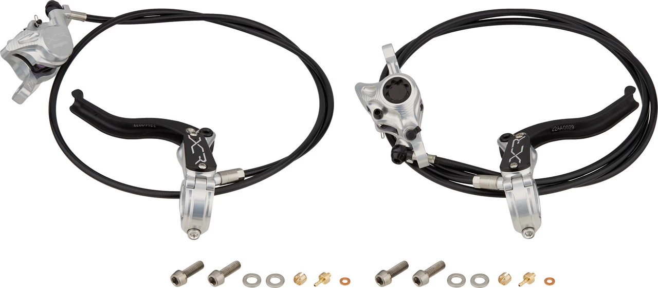 Lieferumfang:2 x Scheibenbremse Hope XCR Pro X2 Postmount, montagefertig befüllt und entlüftet1 x Bremsleitung 900 mm (VR)1 x Bremsleitung 1650 mm (HR)2 Paar Bremsbeläge Hope4 x Schraube Innensechskant4 x Unterlegscheibe groß2 x Olive2 x Insertpin2 x Unterlegscheibe klein