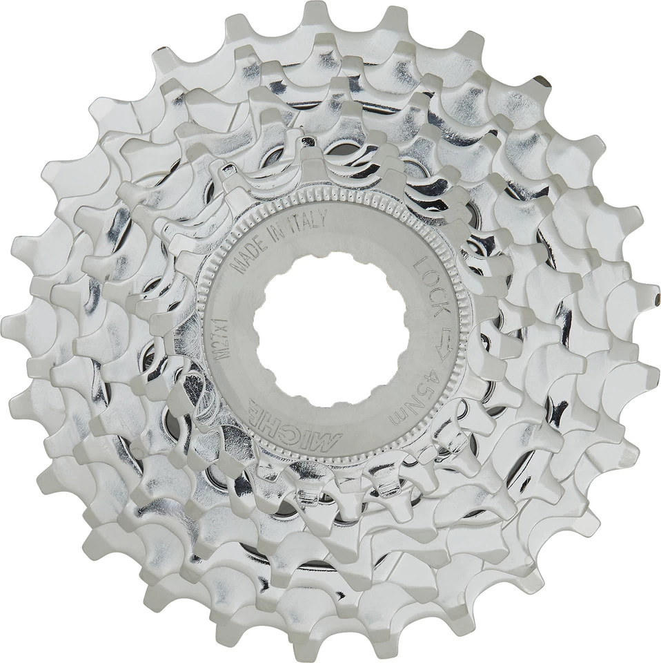 Diese Primato Kassette von Miche hat 9 Ritzel aus verchromtem Stahl und ist mit Campagnolo-Freiläufen kompatibel.