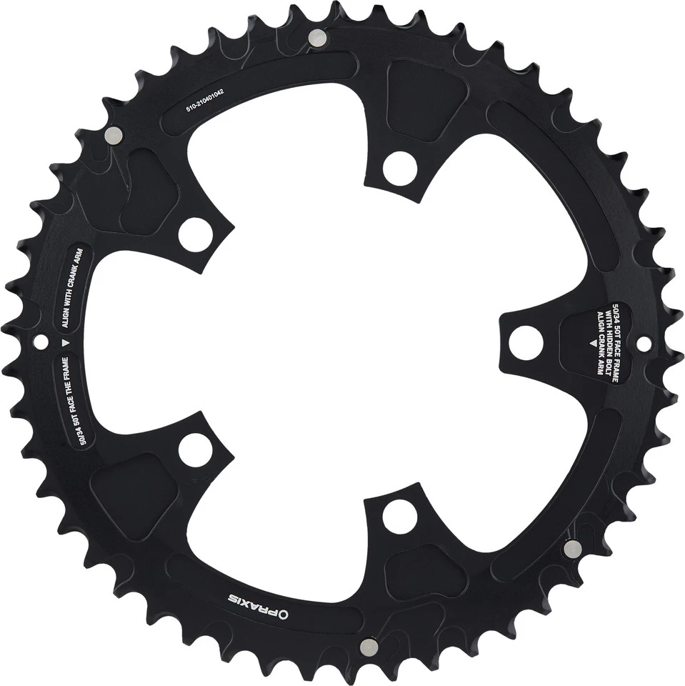 Die fünfarmigen Buzz Road Kettenblätter von Praxis Works mit 110 mm Lochkreisdurchmesser sind im Gegensatz zu ihren Vorgängern auch mit Campagnolo, Shimano sowie SRAM 12-fach-Antrieben kompatibel. Sie zeichnen sich durch ihr besonders geringes Gewicht, ihre Haltbarkeit und ihre hohe Schaltpräzision aus.