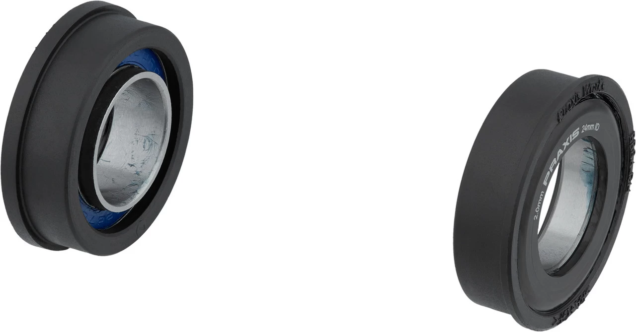 Das Praxis Works M24 BB86 / BB90 / BB92 Innenlager dient dem Einbau einer Praxis M24 Kurbel mit Stahlachse in ein BB86 Road-Tretlagergehäuse oder ein BB90/BB92 MTB-Tretlagergehäuse. Es lässt sich auch für Oval Concepts M24 und für SRAM GXP Kurbeln verwenden, denn auf der Antriebsseite findet sich ein 24 mm Lager, auf der Nicht-Antriebsseite ein 22 mm Lager. Es handelt sich um Industrielager aus Stahl.